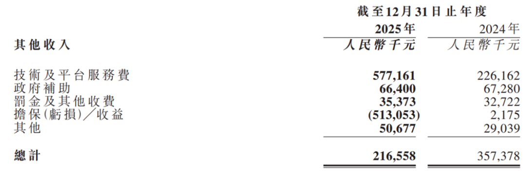 最突出的是担保业务由盈转亏,2024 年担保收益 217.5 万元,2025 年担保亏损达 5.13 亿元,成为利润 “黑洞”。与此同时,技术及平台服务费逆势增长 155.31% 至 5.77 亿元,折射出公司向科技服务转型的尝试。